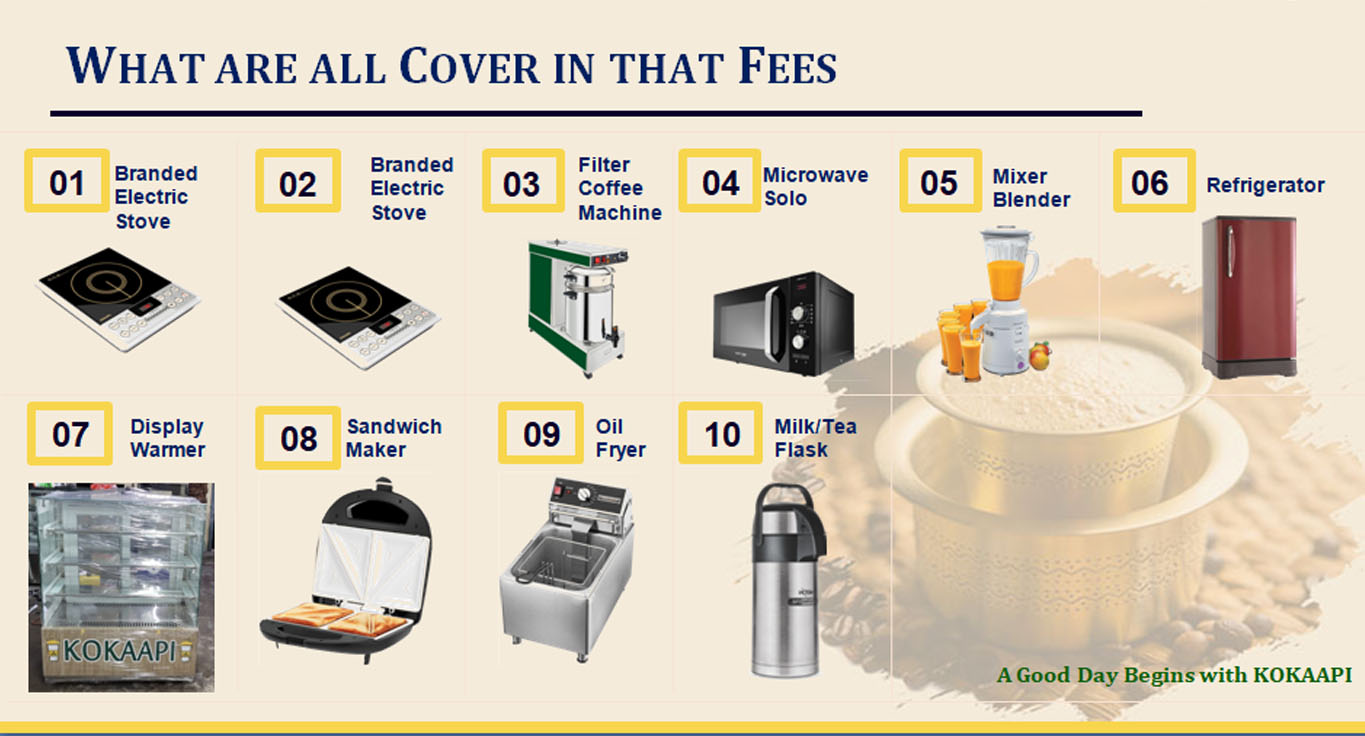 Our franchise fee of ₹2.75 lakhs + 18% GST covers everything you need to start your KOKaapi outlet. This investment includes a comprehensive start-up kit, branding, and all the support needed to set up and operate your franchise successfully.